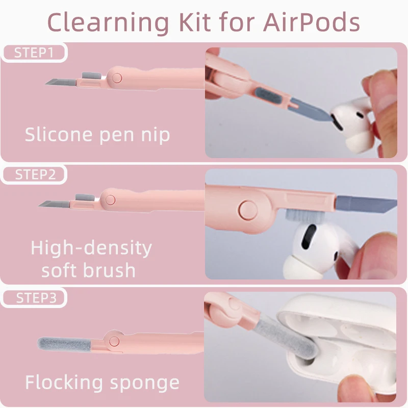 Bluetooth Earphones / Telephones (Airpods iPhone) Cleaning: Foldable cleaning pen with a silicone tip, small high-density brush and flocking sponge, perfect for cleaning Airpod Pro 1, 2 and other earbuds, earbuds charge case and telephones. The silicone tip is to clean crevice stains. The small high-density brush is great for deep clean mesh surface dust. The flocking sponge is to clean the hole of the charging case.