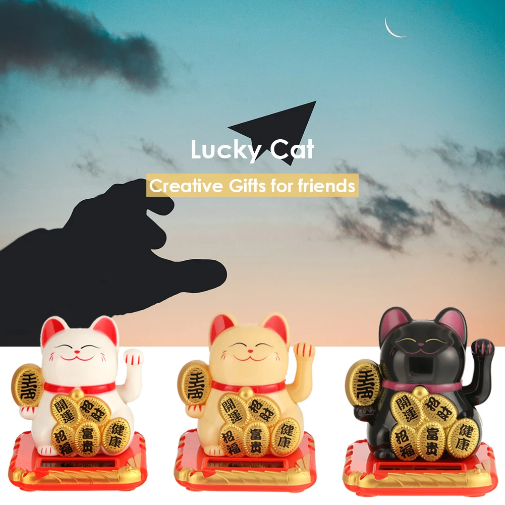Feature: Cat left hand for welcome money, right hand for welcome good fortune. Two hands raised, wealth and fortune both come. Cat is to attract wealth and fortune, the four seasons blossoms, the money full. Cat left hand with gold nuggets, right hand shake for fortune. Around is a bag of gold and silver, blessing the host's life is rich, life is full of happiness. Specification: Material: plastic Color: White, Light Yellow, Black Size(L * W * H): 7.0x6.5x8.0cm/2.76x2.56x3.15in Packaging: PVC display box Note: Solar energy, no need for battery. Note: 1. Due to the different monitor and light effect, the actual color of the item might be slightly different from the color showed on the pictures. Thank you! 2. Please allow 1-3cm measuring deviation due to manual measurement. ![]() 1 X Lucky Cat
