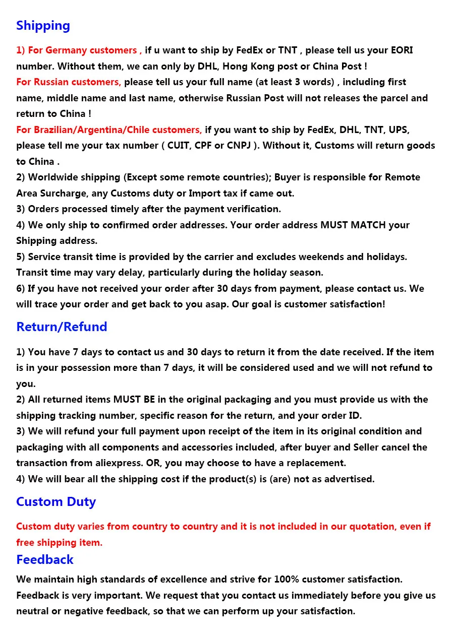 - Please note that international orders may be subject to customs fees or import taxes, which are the responsibility of the customer.